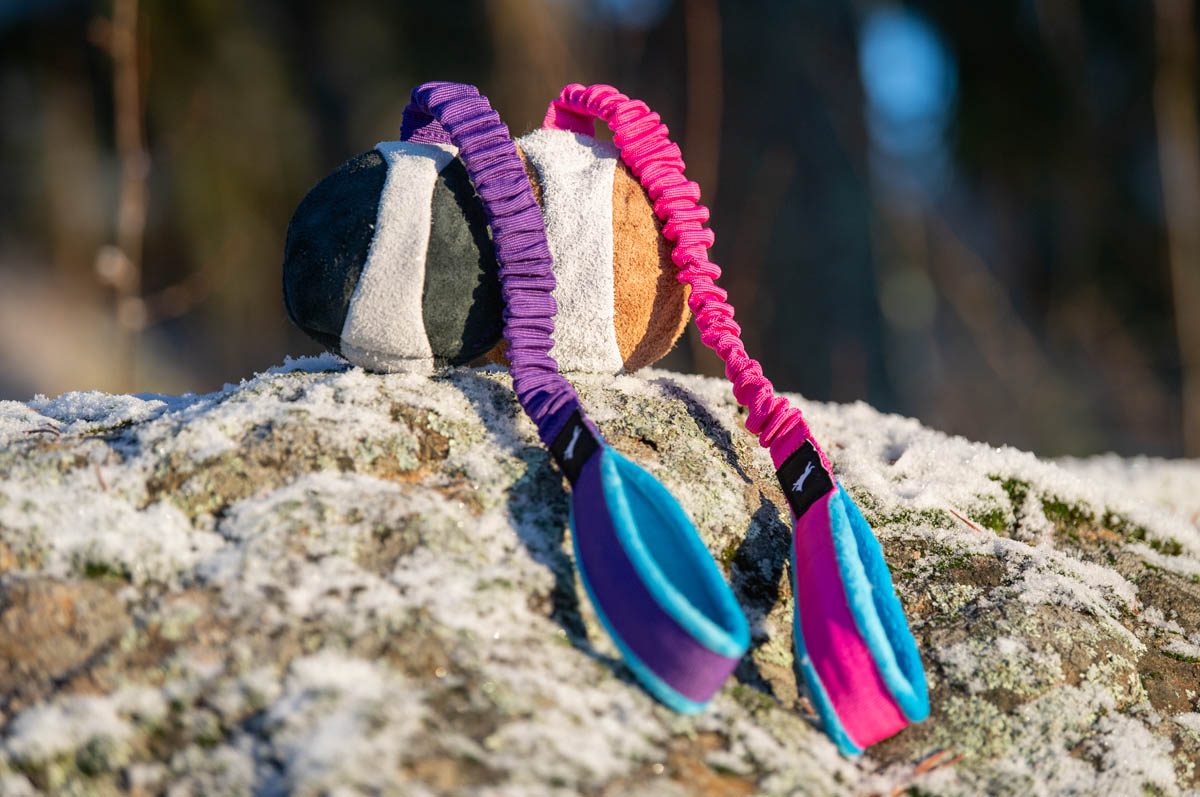 BungeeChewie is our ever-popular Chewie suede ball with a longer, elastic bungee handle. It is a durable, dog-approved ball designed for play, training and rewarding — while also being a sustainable and responsible choice. Handmade in Finland from recycled and upcycled materials, the BungeeChewie ball combines ecological values, premium craftsmanship and irresistible textures that dogs naturally love.