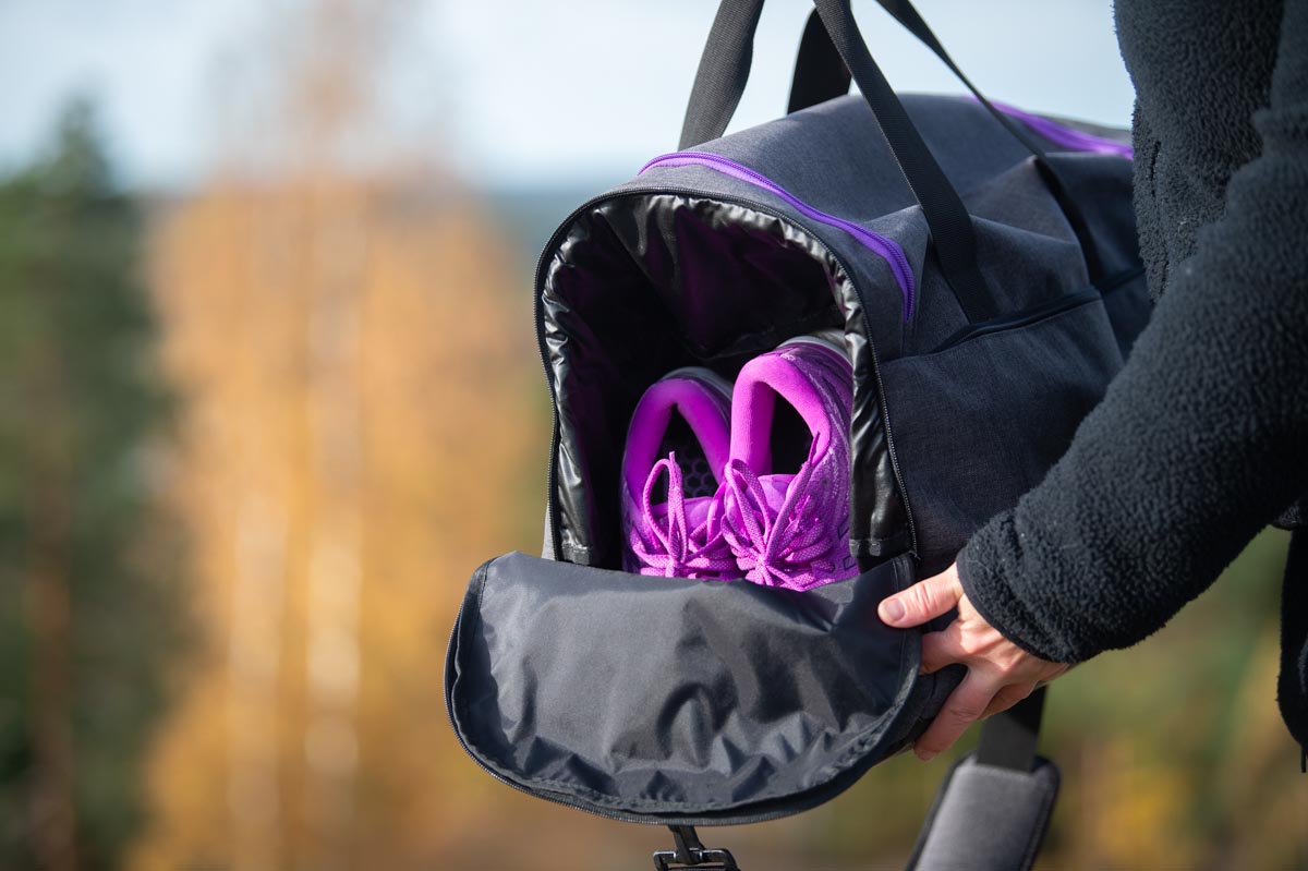* Separate sections for shoes, water bottle, A4-size papers, and small essentials like phone or keys